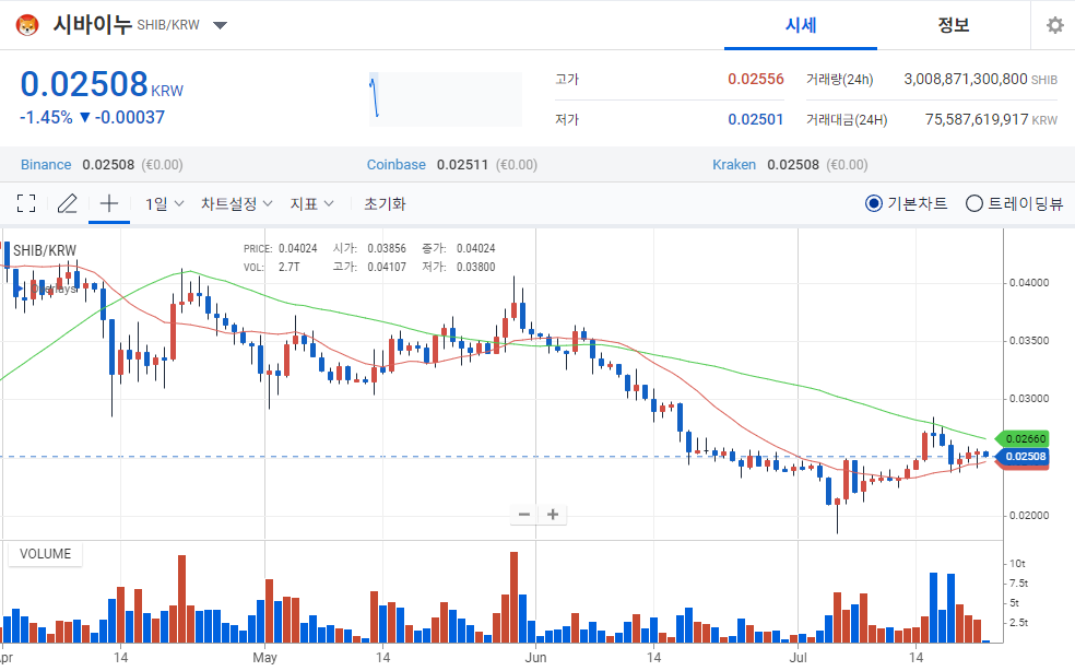 시바이누코인 2024년 7월 22일 오전 10시 30분경 0.02508을 보여주고 있다. 시바이누코인은 밈코인으로 시작하였고, 발행량이 수백조 개에 달하여, 21년 10월의 급등 이후의 가격으로 지속되다가 24년 비트코인 반감기의 시작으로 4배 이상의 급등을 보여준 후 그 성장세가 미미하다.